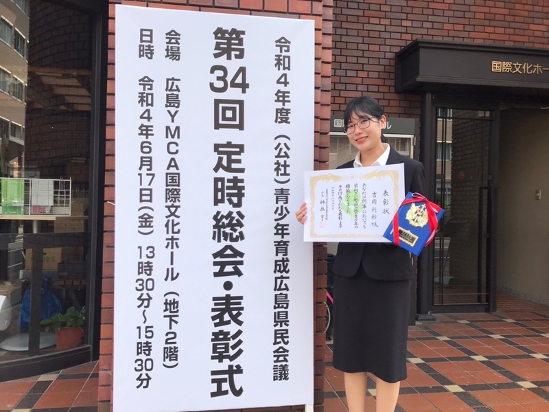 6月17日(金)、公益社団法人青少年育成広島県民会議(県民会議)の第34回定時総会・表彰式(https://hiroshima-jc.jp/5745/)において、薬学部薬学科6年生の吉岡利紗さんが、青少年表彰を受けました。