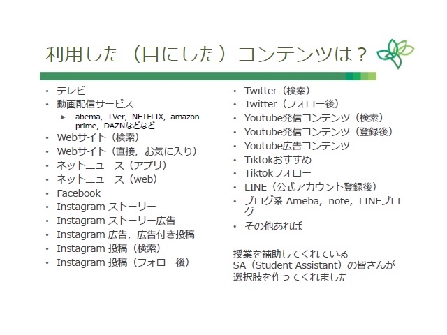 今回、4年生のSAを巻き込むことによって作られた「受験生のときに利用した(目にした)コンテンツは?」のアンケート項目が以下になります。