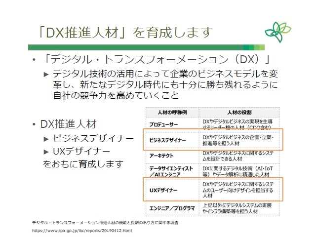 このプロジェクトでは「DX推進人材」を育成しています。DX推進人材の中でも、主にビジネスデザイナー、UXデザイナーを育成しています。