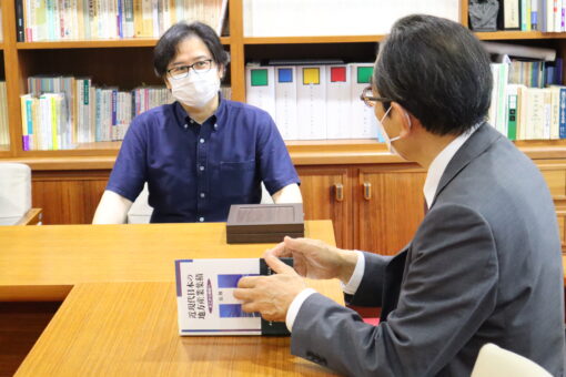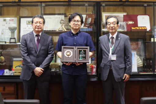 7月14日(木)、張楓教授と楠田経済学部長が学長室を訪れ、大塚学長に受賞の報告を行いました。同書は刊行にあたって福山大学出版助成を受けており、このことについて張楓教授からは、「出版助成を与えてくださった福山大学のみならず、福山大学着任以来、地域産業史の研究を全面的にサポートしつづけてくださった福山大学全教職員に感謝したい」とのコメントがありました。