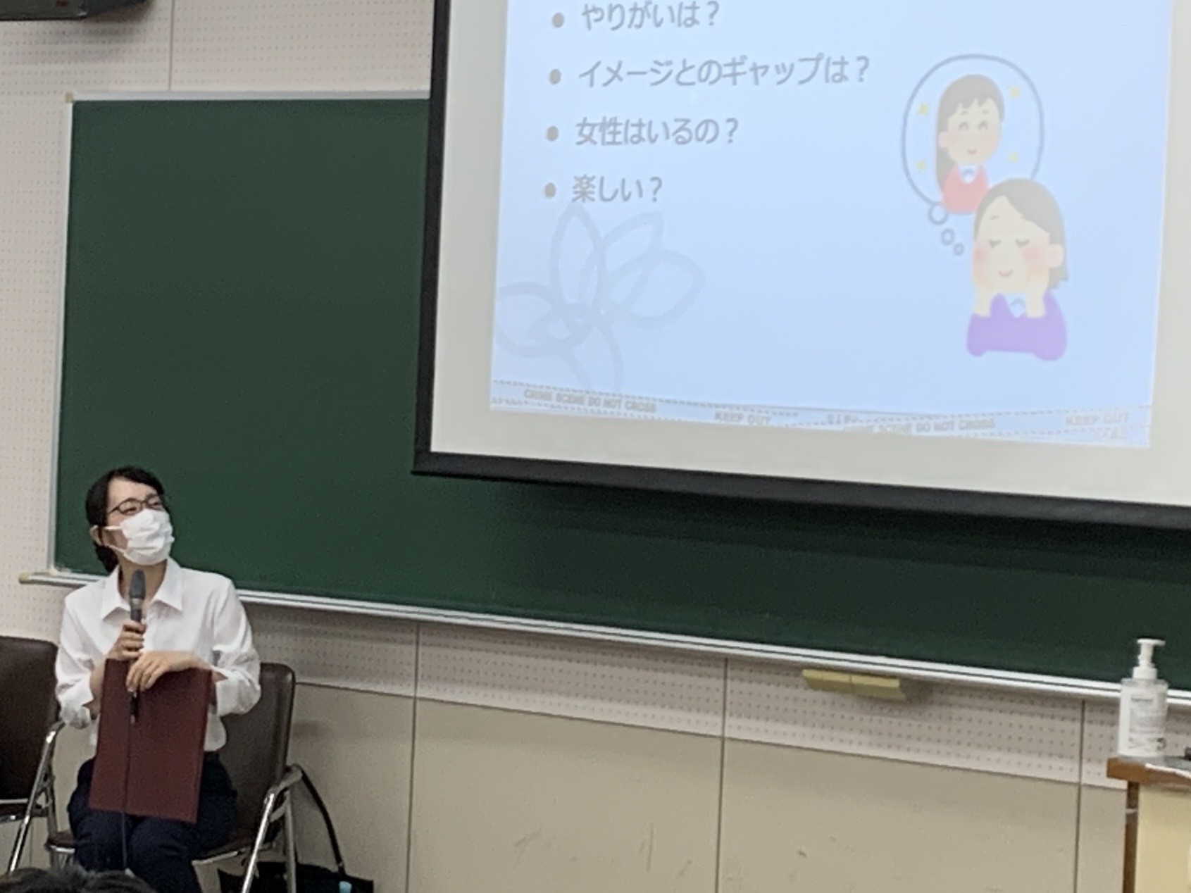 岡﨑さんは、事前に寄せられた受講生からのたくさんの質問に、1つ1つ丁寧に答えてくださいました。科捜研を目指したきっかけから実際に科捜研でどんな仕事をしているのかまで、進路を決めている学生も決めていない学生も、興味津々で聞き入っていました。