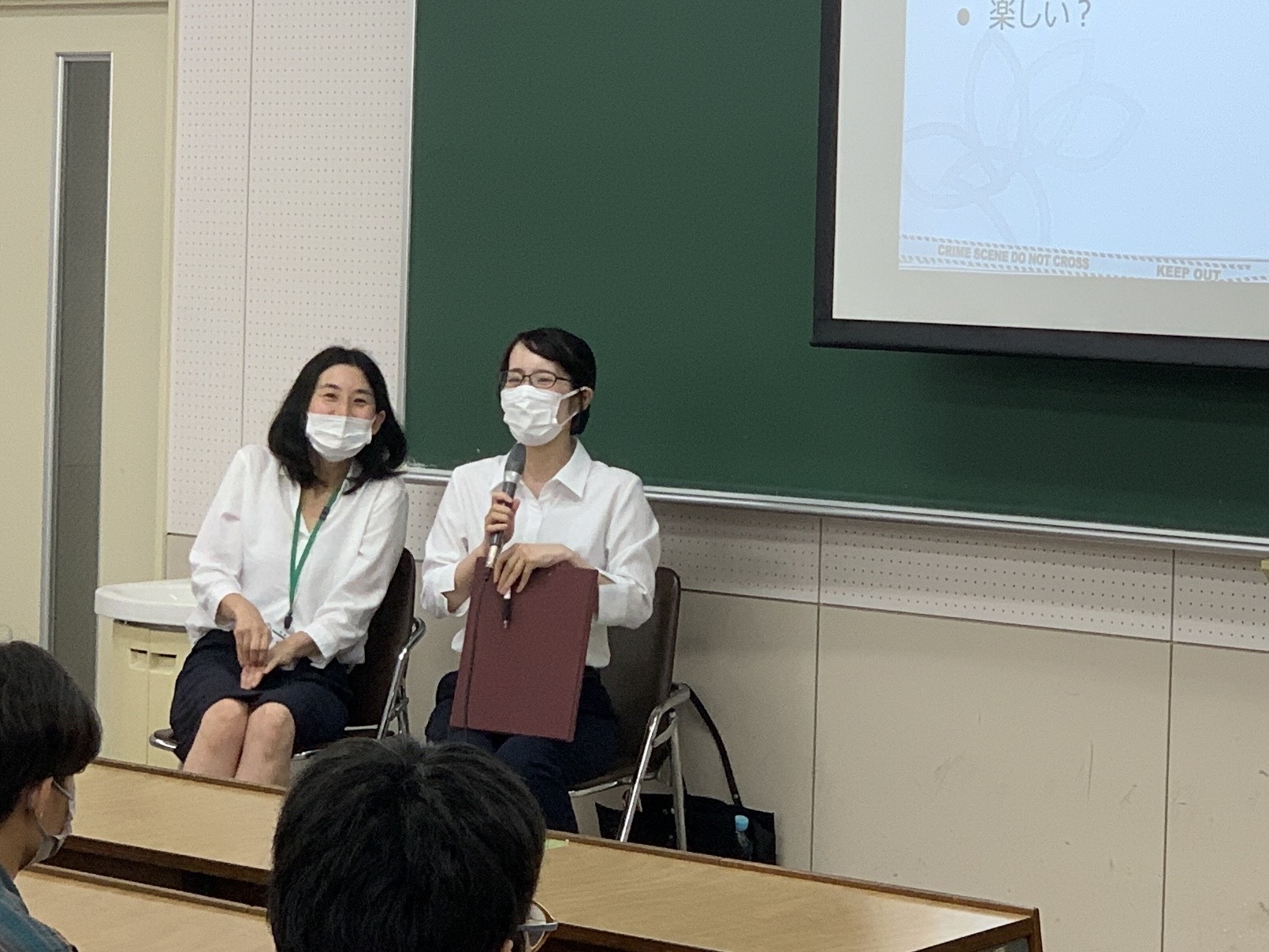 特別講師の岡﨑さんのほかに、実はゲストがもう1人。今年度から助手として心理学科に着任した、同じく本学心理学科及び大学院人間科学研究科の卒業生、かつ元静岡県警察本部刑事部科学捜査研究所の研究員であった、濱本有希助手です。