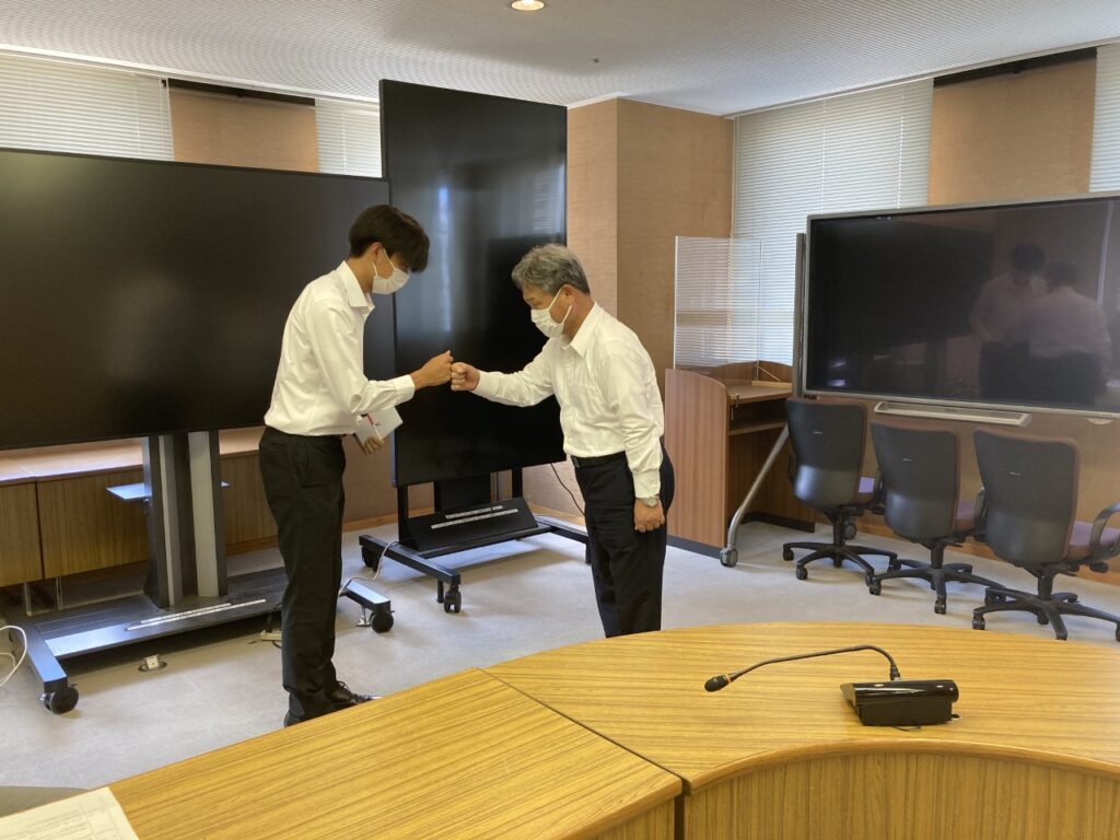 枝廣市長からは「是非とも福大サッカーを全国に轟かせてください!」との熱いメッセージを頂戴し、最後に記念撮影が行われ、表敬訪問は無事に終了しました。