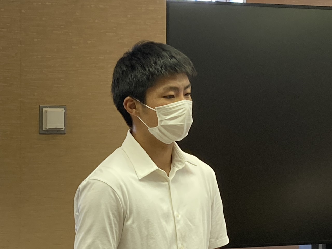 はじめに、的場監督より挨拶があり、平田経済学部長補佐、斜森部長、木村コーチ、河津コーチ、畠中主将、生野副主将、桒原マネージャーの紹介がありました。