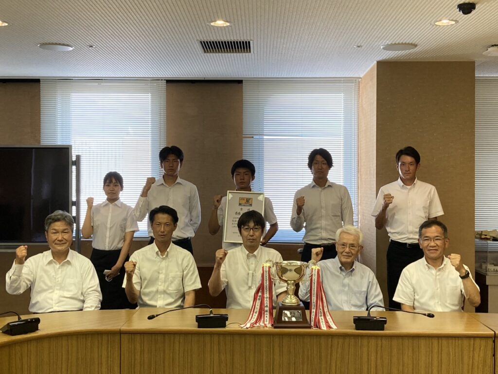 出発に先立ち、8月3日(水)、斜森サッカー部長、的場監督、木村コーチ、河津コーチ、畠中主将、生野副主将、桒原マネージャーが福山市役所を訪問し、枝廣直幹市長及び熊谷寿人市議会議長に出場の報告を行いました。また、永年、福山市役所へ勤務し、枝廣市長とも親しい平田経済学部長補佐も同行しました。