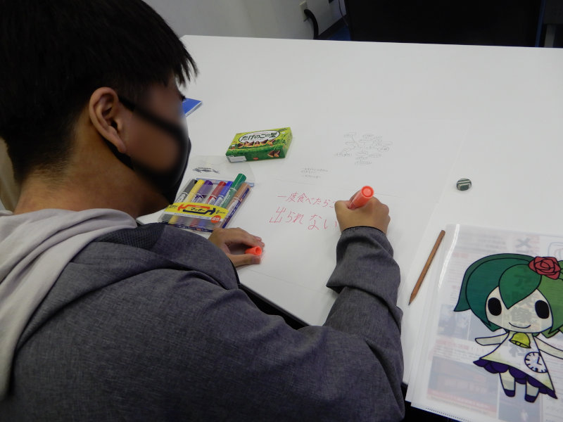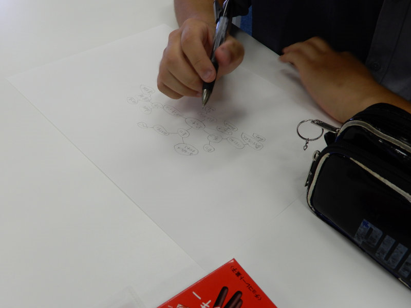 説明後、参加者にきのこの山やパイの実などのお菓子を配り、「イメージマップ」という手法を用いてお菓子に対する自分のイメージを視覚的に表現していきました。