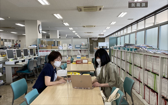 <3年生の佐藤さん(左)にプレゼン資料の作成・コツをアドバイス>