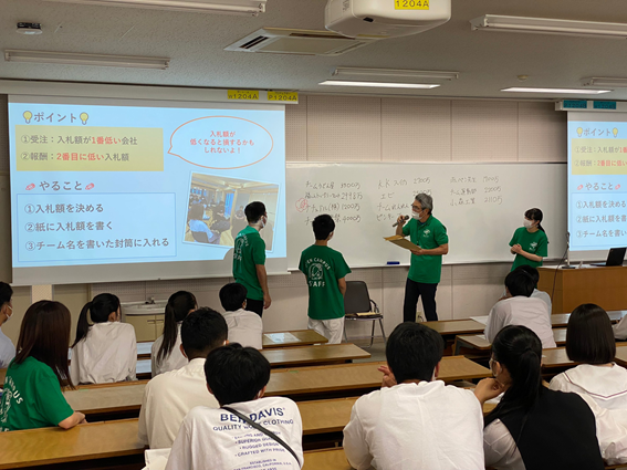 村松講師の模擬講義「制度設計の経済学」に入る前に、実際に入札を体験してもらいました。時間の制約があるなかで、定員60名の高校生をどうすればスムーズにグループ分けできるか、どう説明したら理解してもらえるか、案を出し合いました。