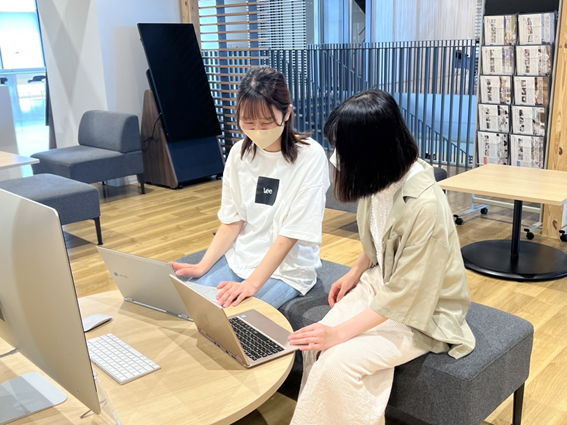<3年生の佐藤さん(左)にプレゼン資料の作成・コツをアドバイス>