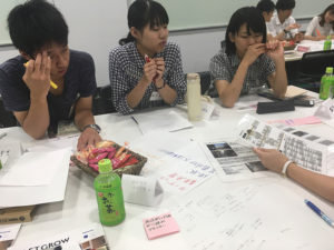 2限目は、モノや社会問題が書かれた16枚のカードから2枚のカードを組合わせて、10年後の未来について考えるグループディスカッションや1人の子供の20年後の幸せな未来を写真を題材に創造していくグループワークを行いました。このコンテンツでは、未来を創造するということを考えるときに、“一人ひとりの生活や生き方と向き合う”というパナソニックの姿勢を知りました。
