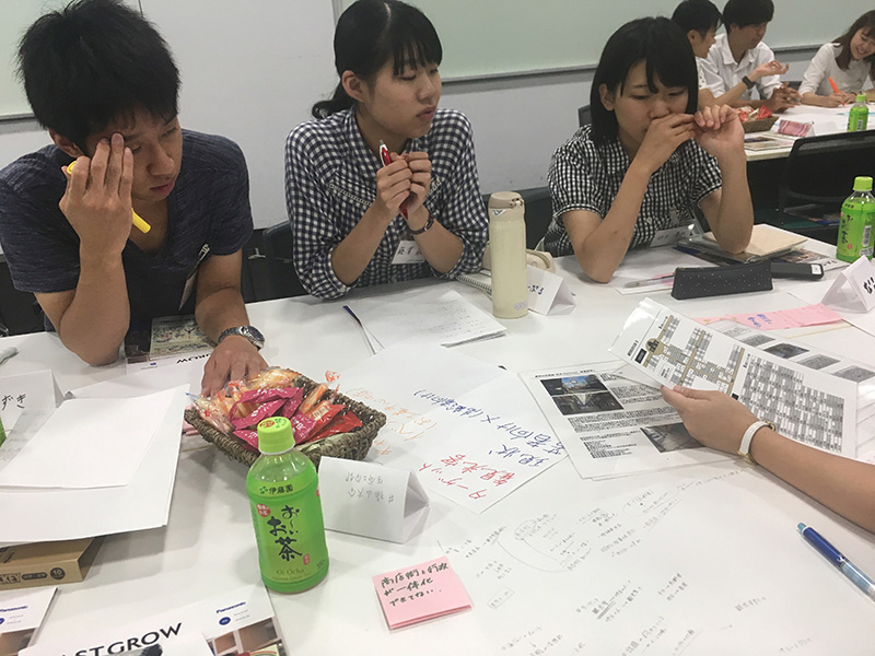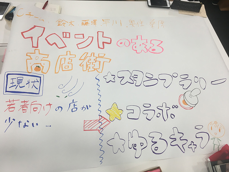 4限目は、この日やったことの集大成として、商店街の復興策を提案するビジネスプランを作るというグループワークを行いました。さらに、ランチタイムも含めて約2時間の話し合いの後、各チーム2分間ずつプレゼンテーションを行いました。話し合いのコツでもある時間配分を決めてから話し合いを始めること、議論を見える化すること、他の人の意見に乗っかることということを意識しながら活動しました。