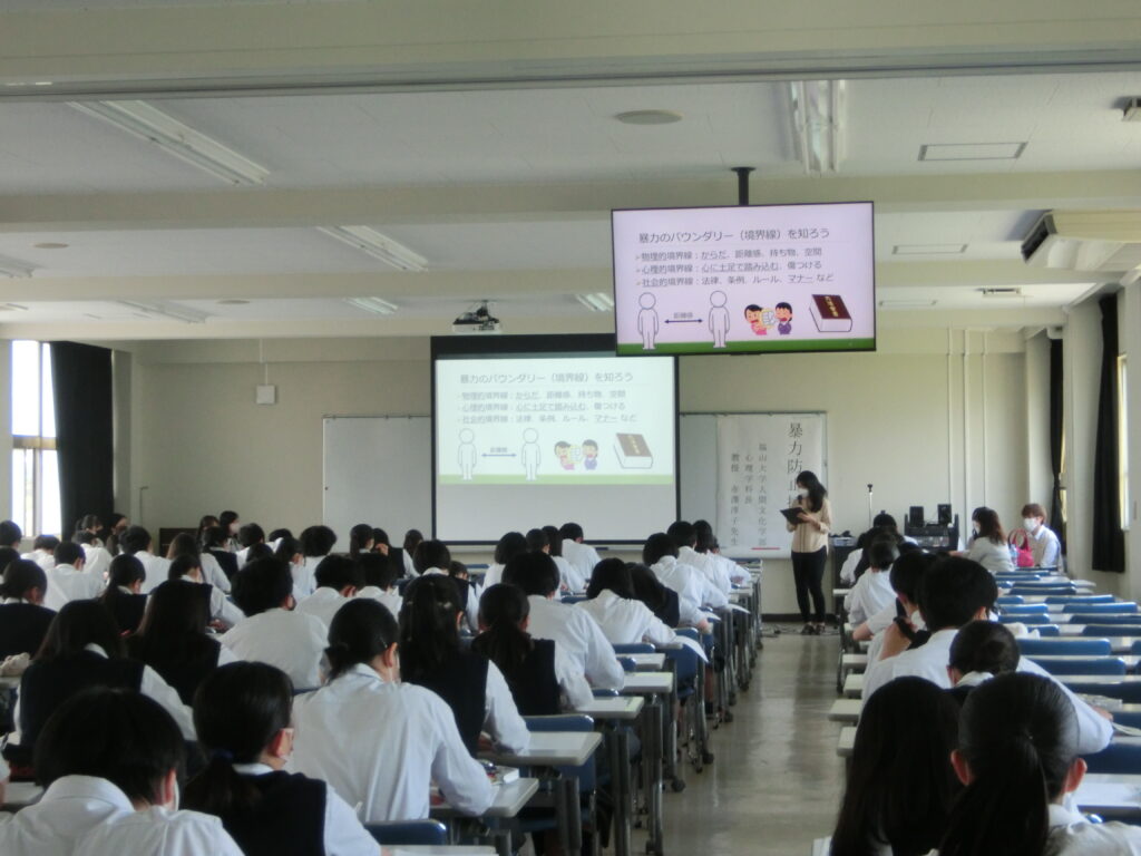 学長から一言:昨年度と違って、コロナ禍のハンディを乗り越え、今年は対面で高校での授業が実現して良かったですね。どうしたら暴力防止についてより良く理解してもらえるか、相当に準備し努力したことでしょう。ひとに教えることは最善の学びです。授業を受けた高校生の皆さんの感想からもレベルの高い授業だったことが分かります。