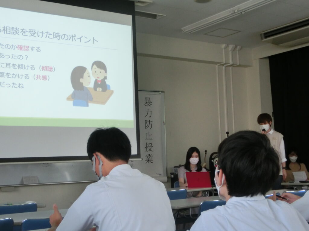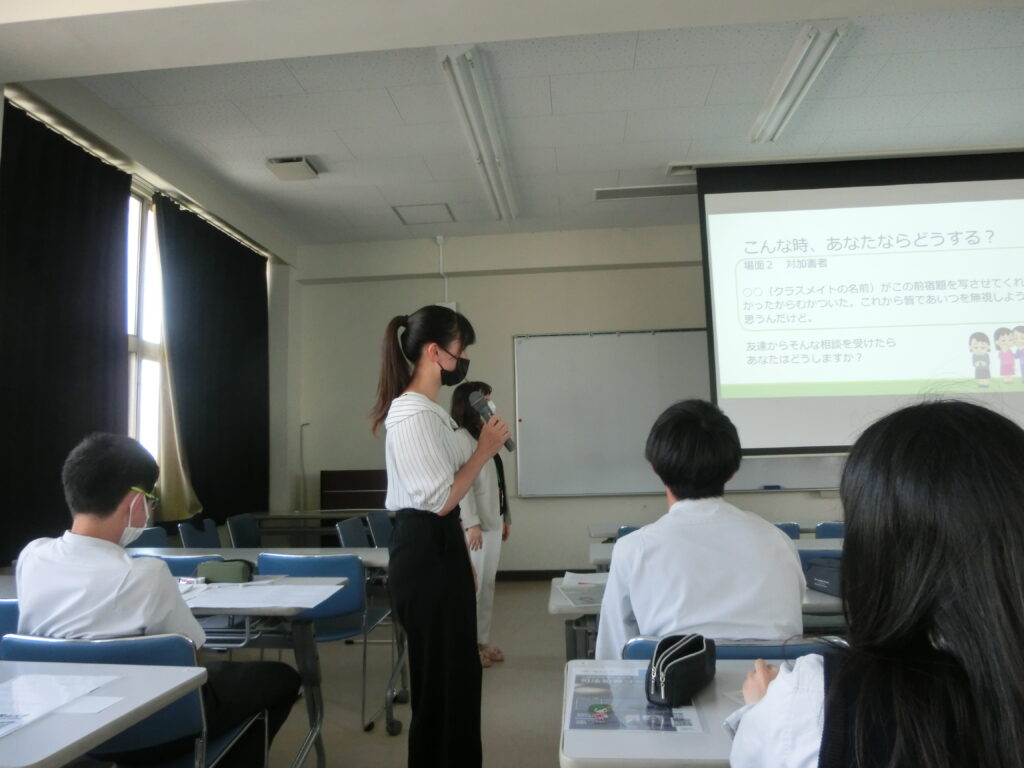 「私は、暴力被害を止める存在になりうるアクティブ・バイスタンダーとは何か、被害者や加害者への関わり方や被害者・加害者から相談を受けたときに心がけるべきことや適切な行動について授業で説明しました。授業の際は、実際に生徒の皆さんに考えてもらうワークが多かったので重要な部分ではゆっくり丁寧に伝えるということを心掛けました。また、自分自身がアクティブ・バイスタンダーという言葉や存在を初めて知り、自分も今回の授業の準備を行いながら理解を深めることができ、とてもいい経験になりました。私自身のこれからの生活にも活かせることが多くあったので、相談にのる際や話を聞くときには今回の授業で学んだことを意識していきたいと思います。」