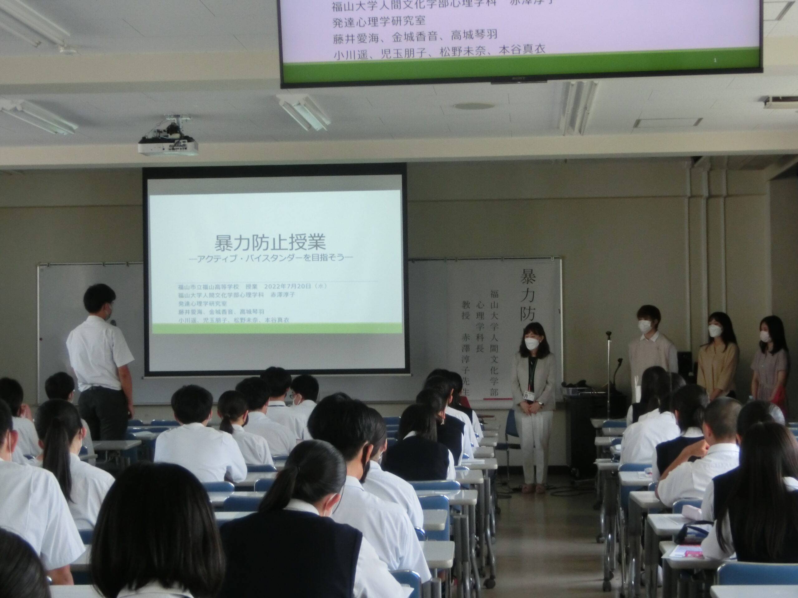 心理学科の発達心理学研究室所属の3年生7名が、7月20日(水)の13:40~15:40に暴力防止授業を行いました。福山市立福山高等学校の6年生192名を対象とした「暴力防止授業-アクティブ・バイスタンダーを目指そう」と題した授業です。