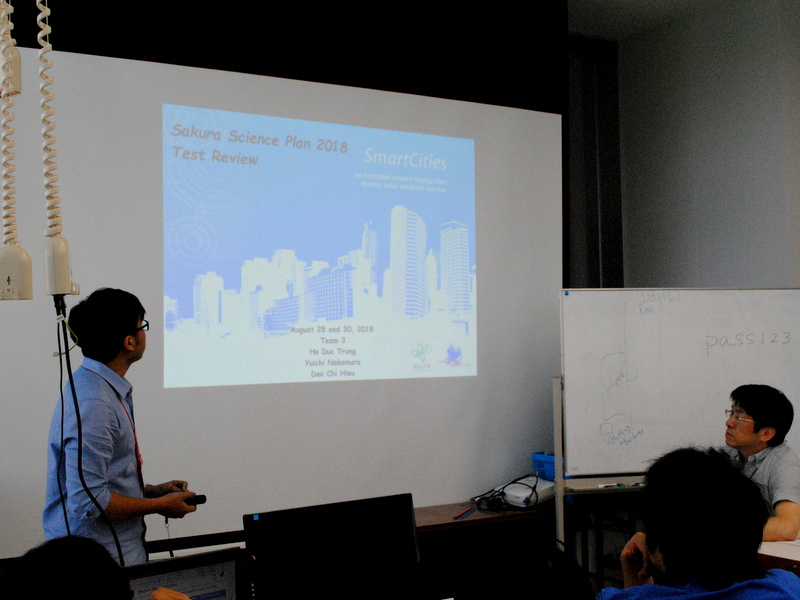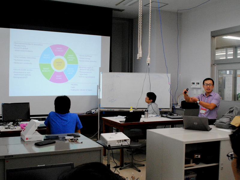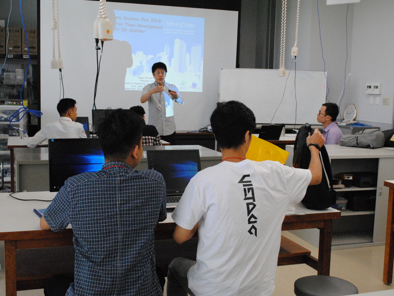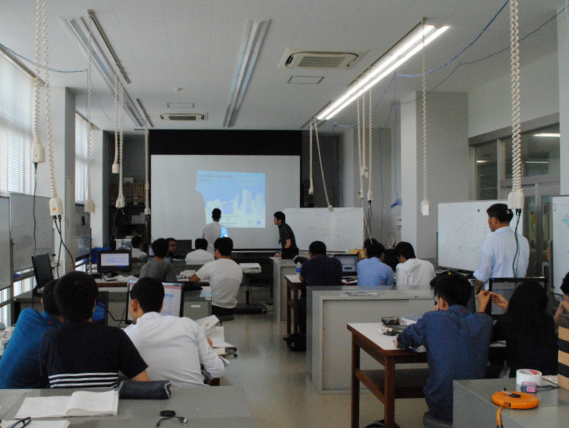 この夏、SAKURAサイエンスプランでベトナムから国立ハノイ土木大学の皆様が福山大学にやってきました。前回の記事に引き続き、今回は、8月28日(火)と30日(木)の2日間を使って開催されたスマートシティ構築のためのインタラクティブな体験型学習(ハンズオンセミナー;HandsOnSeminar)の報告が、担当の関田准教授より届いています。工学部スマートシステム学科(フェイスブックはこちら)の伍賀が紹介します。このハンズオンセミナーは、スマートシステム学科の香川教授、仲嶋教授、田中准教授、関田准教授、沖准教授、そして私が参加し、スマートシステム学科の学生の皆さんにも協力していただき、実施ができました。