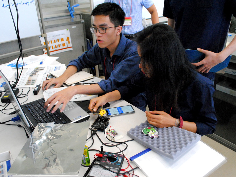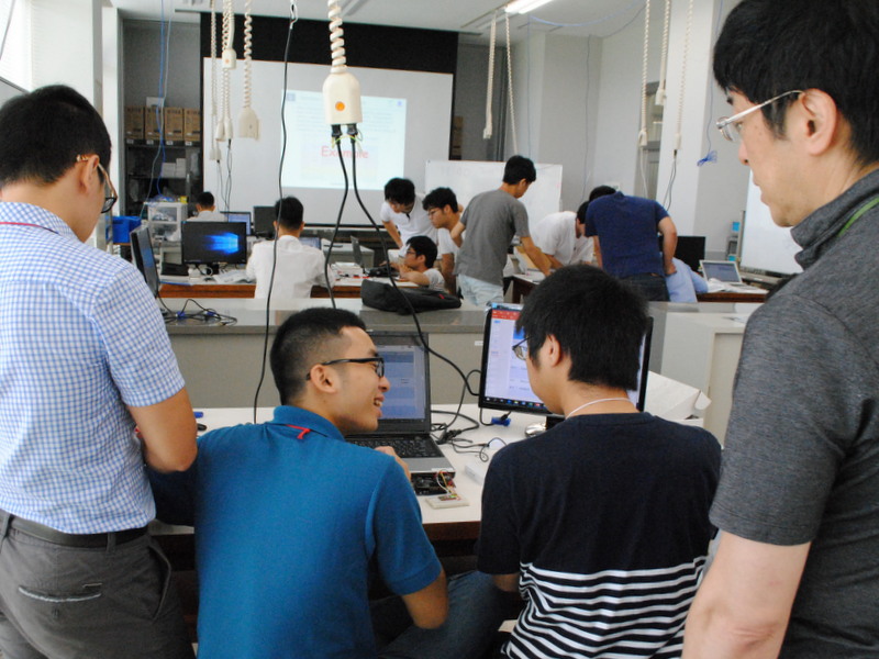 1日目は、ハノイのスマートシティ化に必要な課題とそれをIoTで解決する方法をシステム工学のV字モデルに従ってグループで討議し、その一部を検証するためのセンサを使った実験機を設計・製作しました。ハノイの住民は何を求めているか、その検証実験はどうするかといった慣れない技術検討を短い時間の中で、ワイワイ楽しそうに実行してくれました。さすがにエンジニアの卵たちです。目を輝かせていたのが印象的でした。