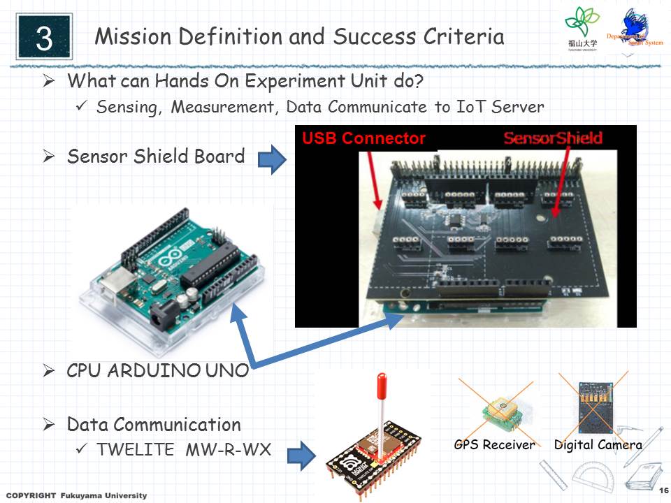 今回の体験学習に用いられる実験装置は、フィジカルコンピューティングで広く利用されるArduinoマイコン、様々な環境情報が取得できるセンサデバイス、そして取得されたデータを遠く離れたコンピュータに送信できるアンテナTWELITEデバイスで構成されています。