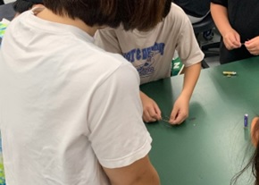 毎年、電気に関するテーマを設定しているのですが、今年のテーマは「モータをつくろう」としました。ご存知の方も多いかもしれませんが、「単極モータ」と呼ばれる最も単純な構造のモータを作って電流と磁力の関係を知ってもらいました。最初に、私から簡単に電気でモータが廻る仕組みを絵で説明した後に、早速、工作開始です。ただ、構造が単純なことと、作ることの難易度は違います。参加した小学生の皆さんが、学生スタッフ、お家の方、先生に手伝ってもらい、四苦八苦しながらも全員完成しました。
