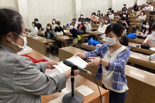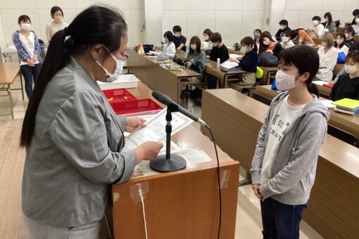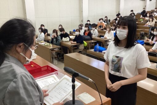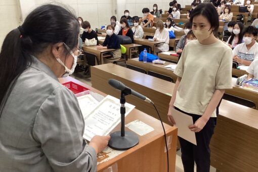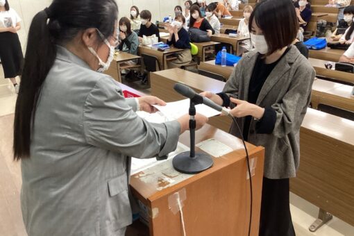 薬学部6年生約140人の前で、井上敦子学部長から受賞者へ表彰状が手渡されました。まずは薬局ポスター賞からです!兼城さん、熊本さん、受賞おめでとうございます!