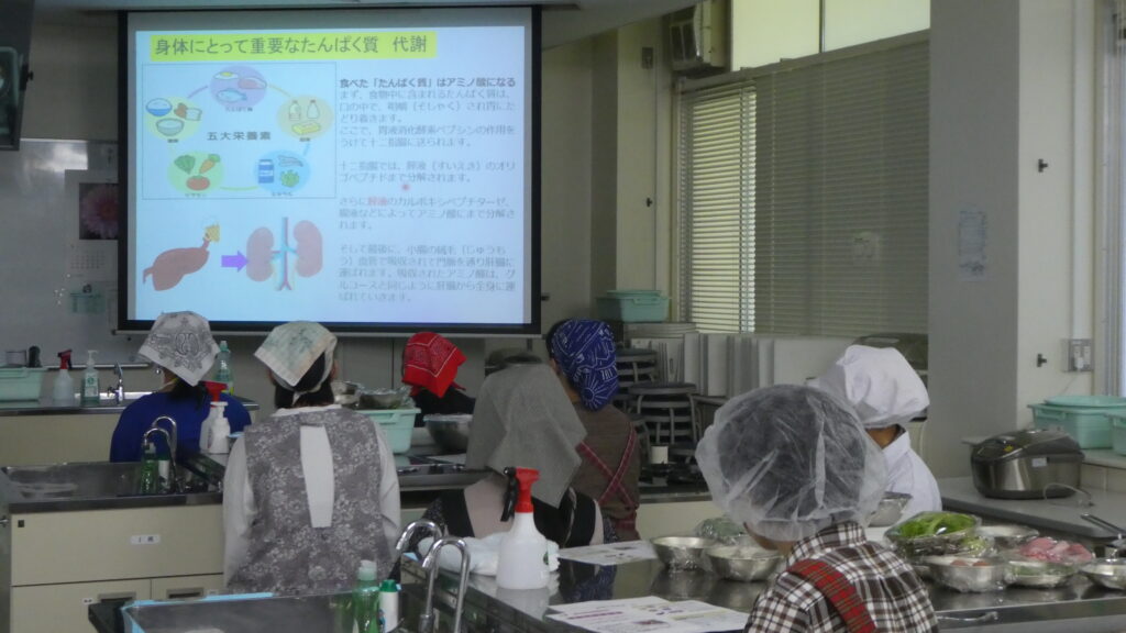 今年のテーマは、最近流行りの筋肉への関心に着目し、「たんぱく質の上手な摂り方」と題して、1日に摂りたい目標量や食品の例をイラストなどで紹介しながら、年齢ごとの必要量のお話をしました。皆さん、毎日たんぱく質食品を食べていますよね? たんぱく質食品とは、肉類・魚介類・卵・牛乳・乳製品・大豆製品ですが、これらは食べ溜めができません。一度に食べて、後は食べないような偏った食べ方は不可です。日々食べることを継続しなければなりません。ナゼかって? たんぱく質は日々消費され、代謝されているからです。身体を構成する栄養成分ですが、材料となるたんぱく質の補給が無ければ、自分の身体を壊してまで、必要な血液などに再合成されます。