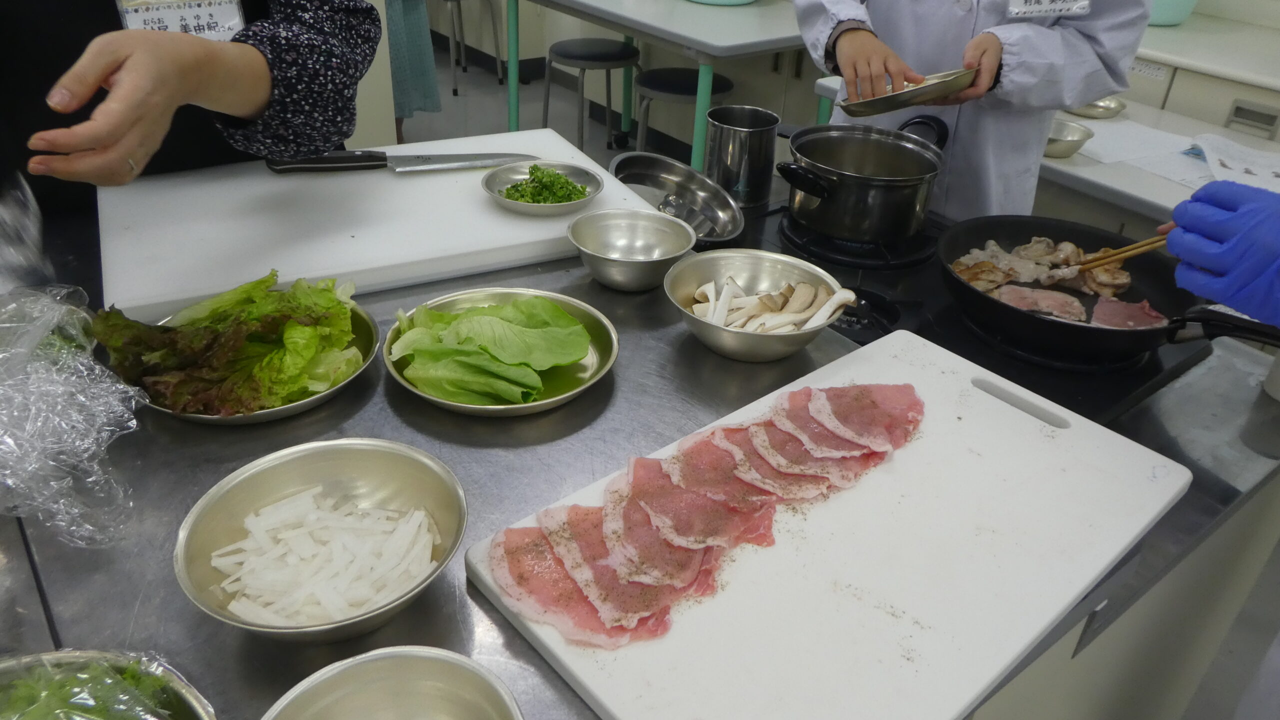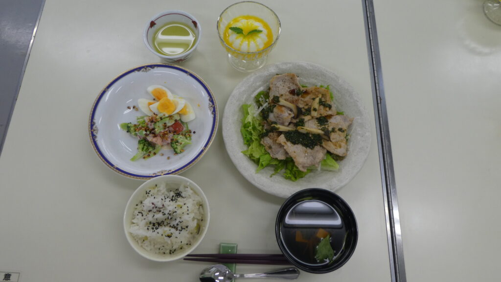 さて、今日の実習献立を紹介します。秋の味覚も取り入れて、さつま芋ご飯、焼きしゃぶの香味だれ・付け合わせ野菜、パワー卵サラダ、豆腐とえのきの澄まし汁、ミルクゼリーみかんソースの5品です。たんぱく質の総量では50歳代女性の1日の必要量の半分以上が摂れるよう、高めに設定しています。豚ロース肉は、焼いて油を溶かし、その油をペーパーで吸着して、しゃぶしゃぶ状態を再現しました。さっぱりといただけますよ!