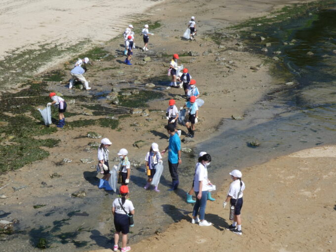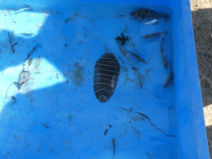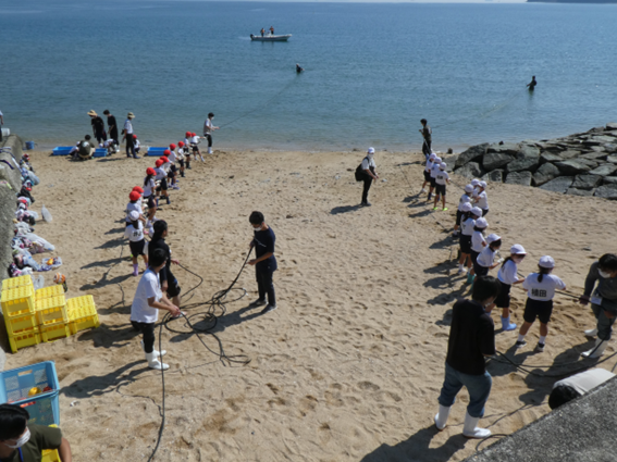 午前の干潮時に合わせた地曳網では、アイゴ、クロダイ、シロギス、シマウシノシタなどが獲れました。また、今回は参加人数が多かったため、グループに分かれて生き物観察や海岸清掃にも取り組みました。