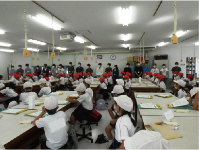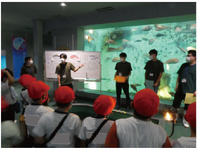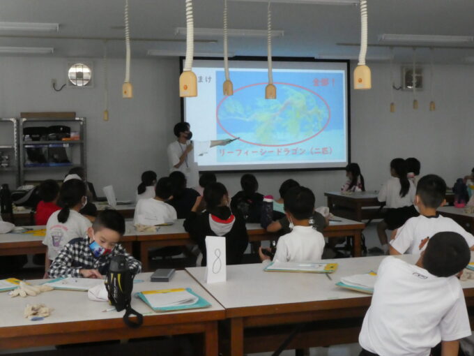 午後からも、密を避けるために2組に分かれて、海の生き物の擬態に関する講義室学習と、「鮪」や「鰯」などの魚偏の漢字の由来から魚の生態や特徴を学ぶ水族館学習の入れ替え制を取りながら進行しました。小学生に理解してもらえるように、学生たちも一生懸命です。