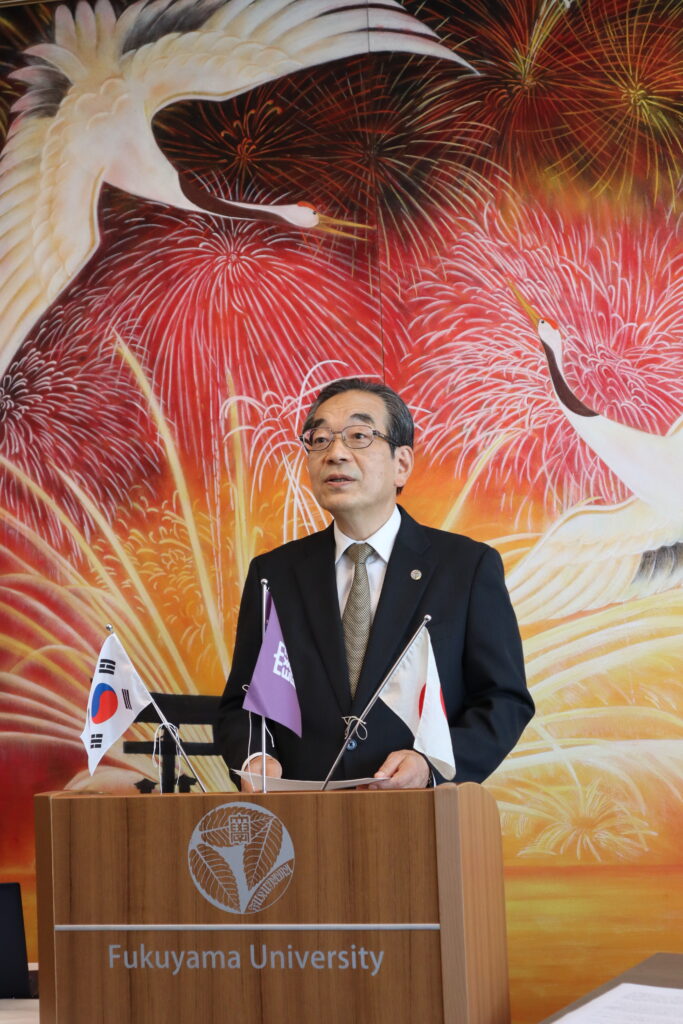 続いて、大塚学長からは、韓国語による梨泰院群衆事故に対するお見舞いと自己紹介の後、学部構成が類似した両大学間の教育・研究両面での交流促進への期待が述べられました。また、福山市の鞆の浦が江戸時代に朝鮮王朝から派遣された外交使節・朝鮮通信使ゆかりの地であることにも触れ、このような繋がりを大切にして交流深化に取り組んでいきたいとの抱負が述べられました。