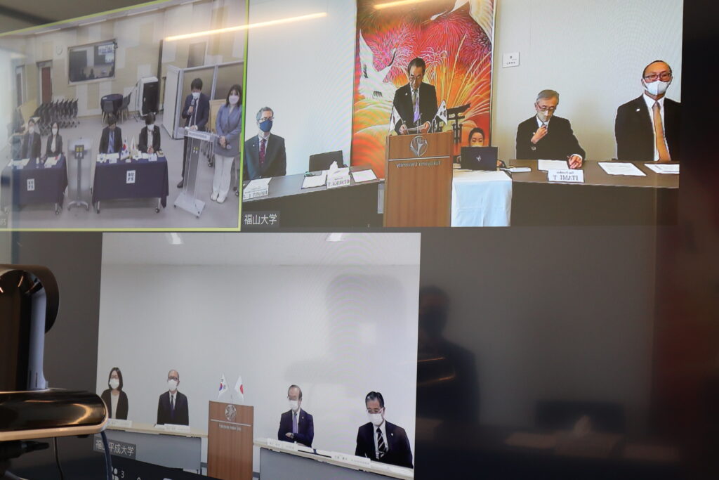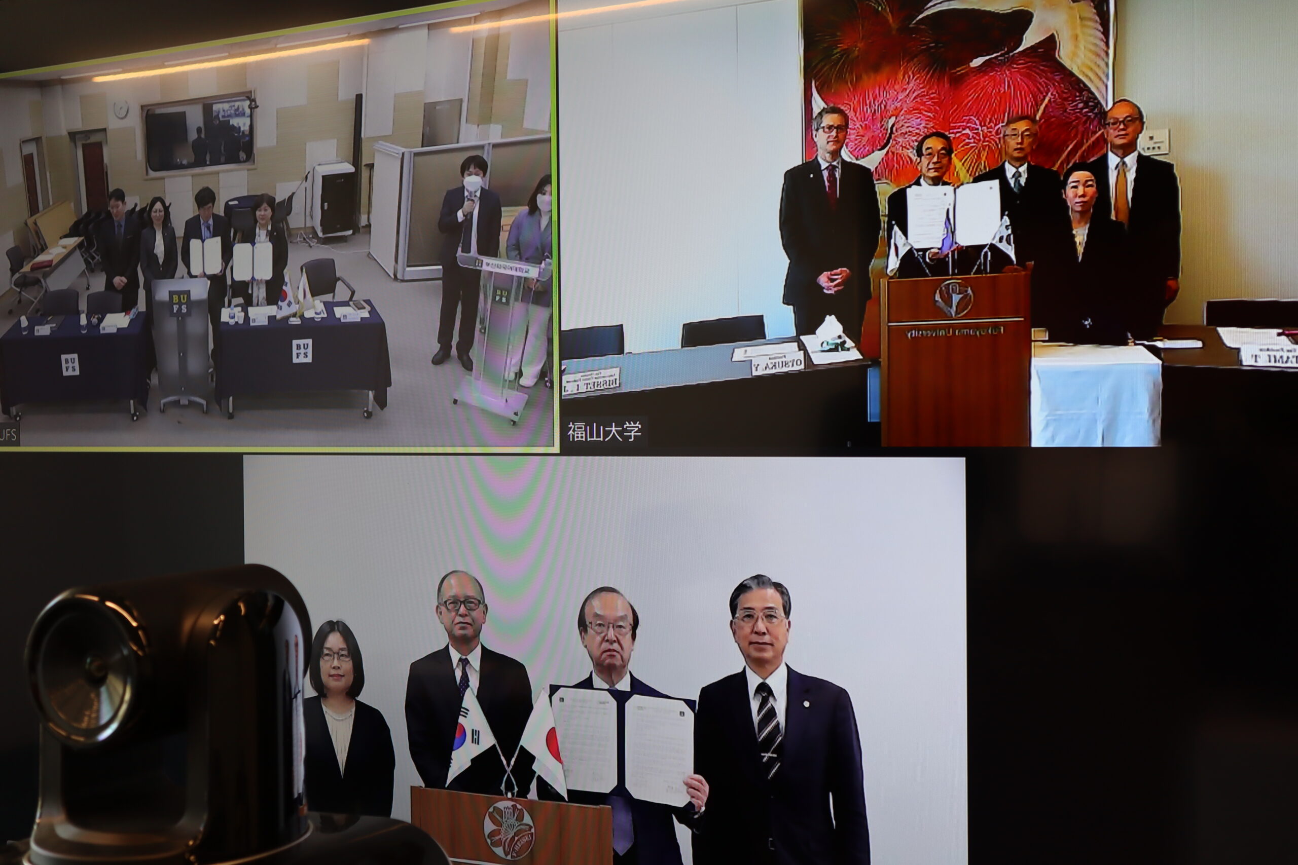 先日のバングラデシュ・ノースサウス大学に続き、大学間では韓国初となる学術教育交流協定を締結しました(*)。今回の協定調印式は、福山大学の姉妹校である福山平成大学も加わり、3大学をインターネットで結んでの協定締結式となりました。その様子をご紹介します。(国際交流課 投稿)
