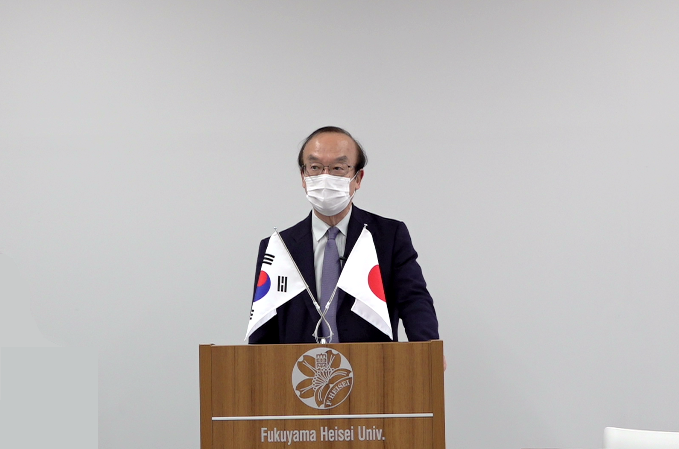 新型コロナウイルス感染症の影響により、オンライン形式を取らざるを得ませんでしたが、今後お互いを自由に行き来できる日が一日も早く到来することを願っております。釜山外国語大學校の学生・教職員の皆様方、福山大学に是非お越しください。この度の協定締結により、双方の関係が更に深まり、学術教育交流の推進が期待されます。