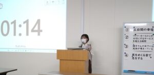 学長から一言:自分の好み・お薦めの本の魅力をいかに上手に聴衆に伝え、読んで見たいと思わせるかのプレゼン力を競うビブリオバトル。地区予選を勝ち抜いて決戦に臨んだ高田結衣さんの奮闘ぶりを想像しました。惜しくもトップにはなれなかったものの、健闘を大いに讃えます。