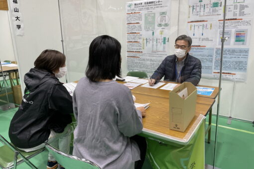 社会連携センターのブースにあるテーブルには、社会連携センターへ事前予約の相談申し込み名簿が置かれていて、相談時間は各15分に設定されていました。その時間内に相談を受けて回答や交流を行うことになり、合計で11の企業や機関の相談を受けました。社会連携センターのブースを訪問された方々への応対や他ブースへの訪問を通して、福山大学社会連携センターの運営目的を説明するとともに、参加企業や機関からの相談を受け、マッチングの可能性に向けた検討及び参加大学の連携状況について交流を行いました。