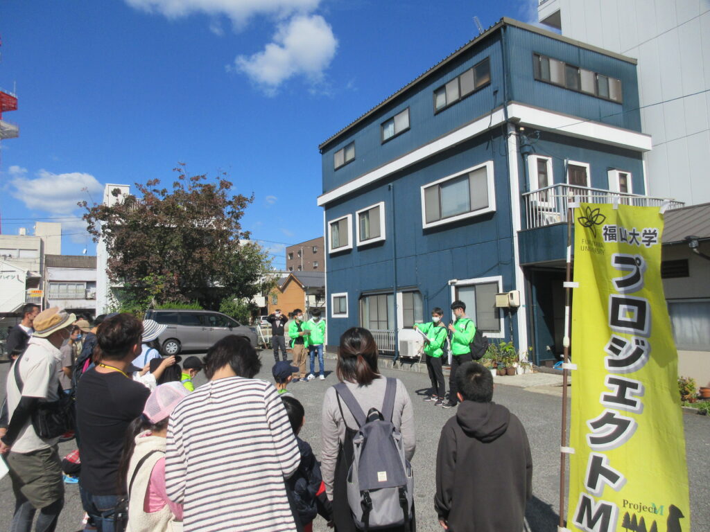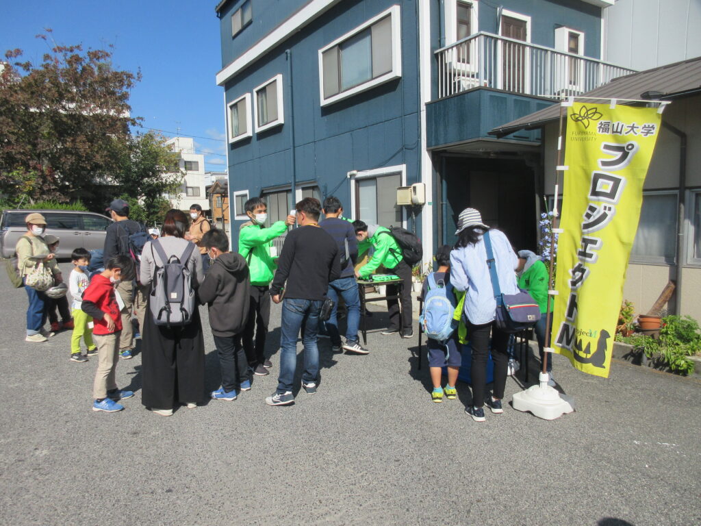 気持ちよく晴れあがった10月29日(土)、12時の集合時間までに12組35名の親子連れがスクールバス乗り場に集まりました。体温測定、マスク着用などのコロナ対策をして、Mのメンバー紹介、簡単な挨拶を経て、大学のバスに乗り込みました。また、バスの中では学生がMの活動や福山大学、因島キャンパスの説明を行いました。