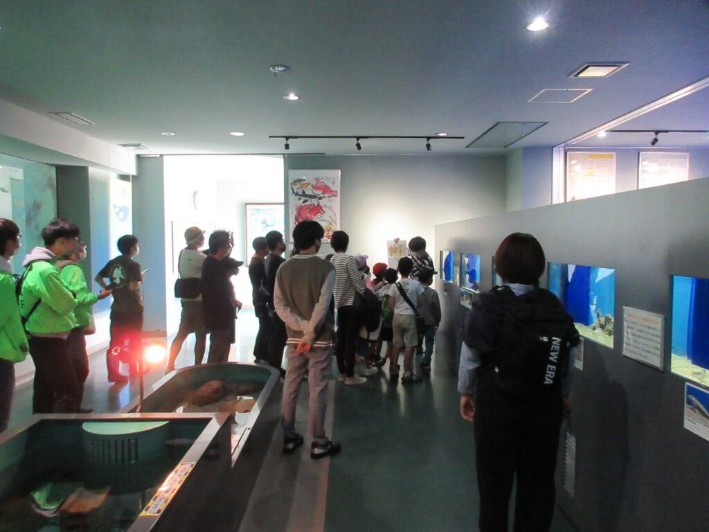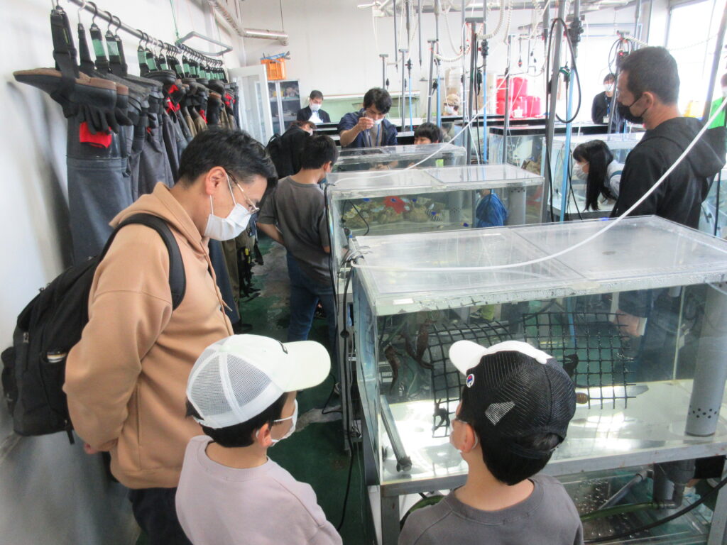 この催しは、プロジェクトMが呼びかけて因島キャンパスに地域の親子連れを招待して、水族館やキスの養殖施設での瀬戸内海の生き物との触れあいや実習船第二爽風丸の乗船体験などを通じて、地域の人たちに因島キャンパスをよく知ってもらうことを目的としています。もちろん、博物館実習の授業を履修している海洋生物科学科の学生にとって、展示解説の実践の機会にもなっています。