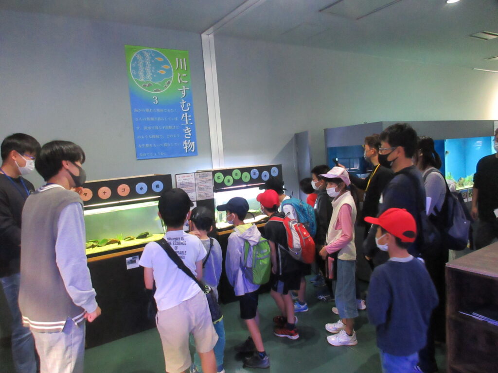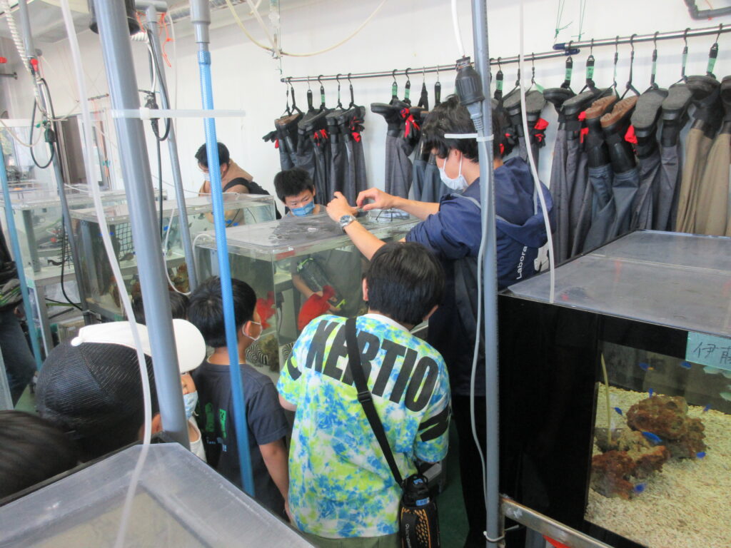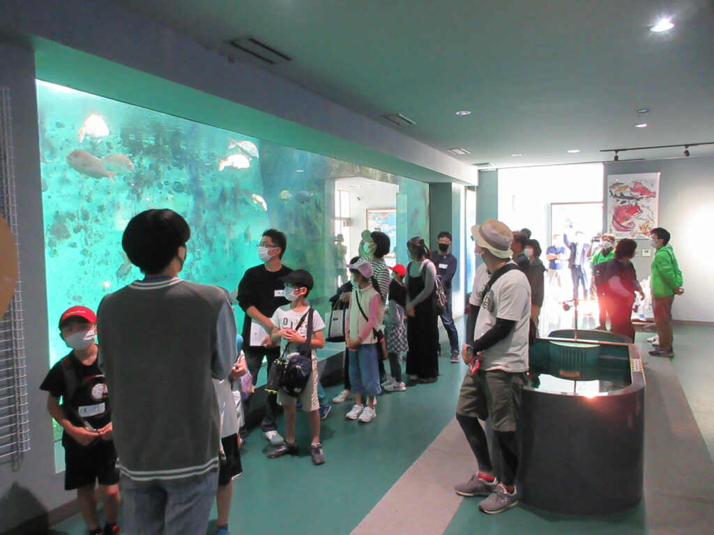 水族館では、実習の学生さんたちがそれぞれの担当の水槽の魚について順番に説明してくれました。海の魚だけではなく、川の魚の展示もありました。今年は水族館が休館続きだったため、学生さんも久々の説明という感じでちょっとアタフタ感もありましたが、親子ともしっかり聞いてくれていました。質問が出ても、なかなか上手に答えていましたよ。