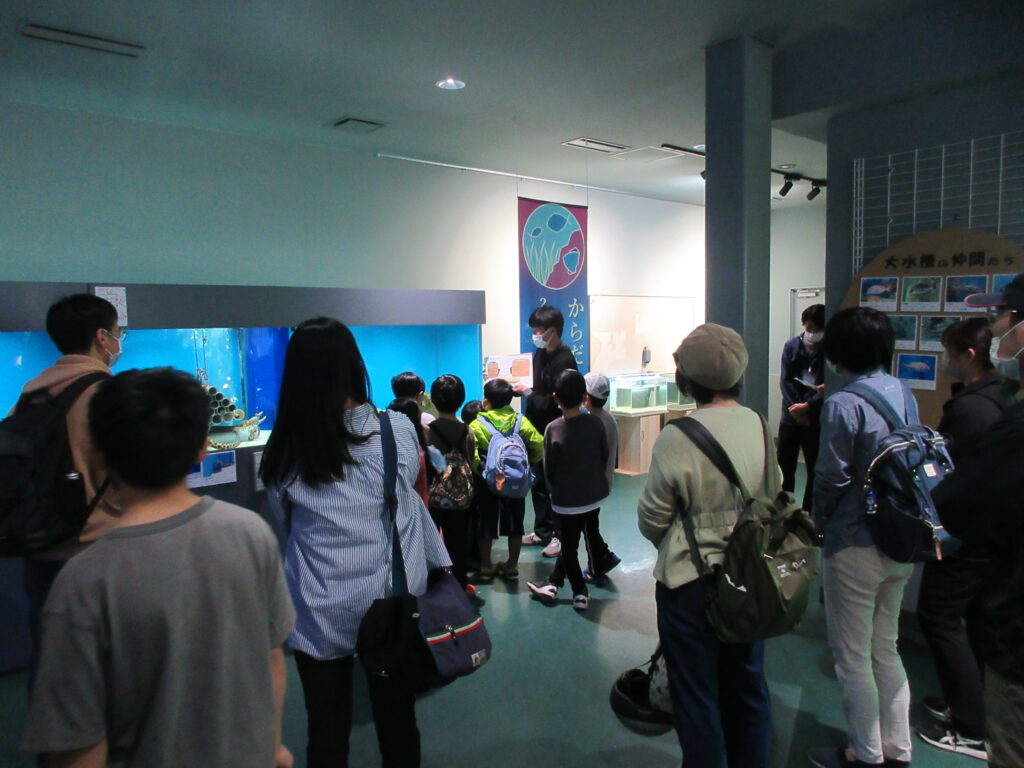 さらに、水族館のバックヤードも見学しました。バックヤードとは何をするところかを学生が説明すると、それにえらく反応しているお子さんもいました。色とりどりの小さな魚やタツノオトシゴに子どもたちは見入っていました。圧巻は大型水槽の裏側です。何人かずつに分かれて上まで登らせてもらいました。ちょうどエサやりタイムということで、学生が準備してくれた餌を投げ込むと「バシャ・バシャ・バシャ!!」とマダイやクロダイなどが水しぶきをあげて食べに来ます。これには親子ともども歓声が上がっていました。