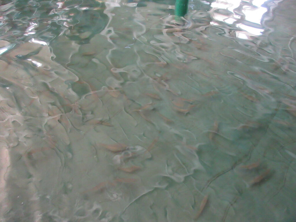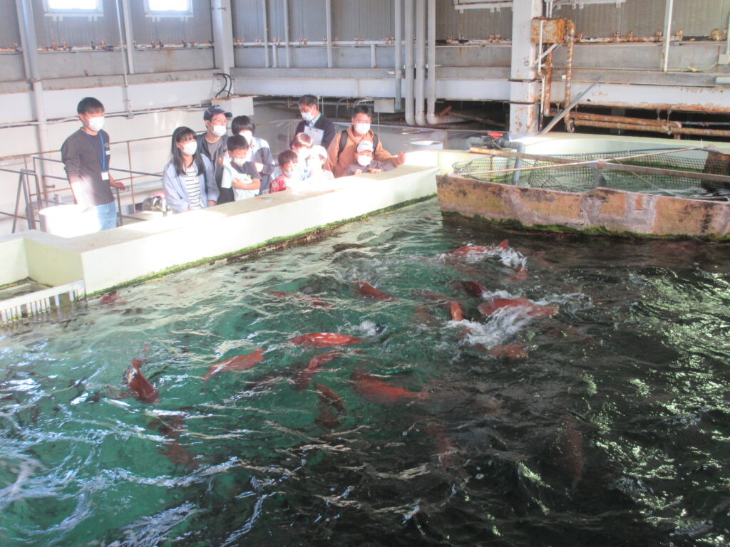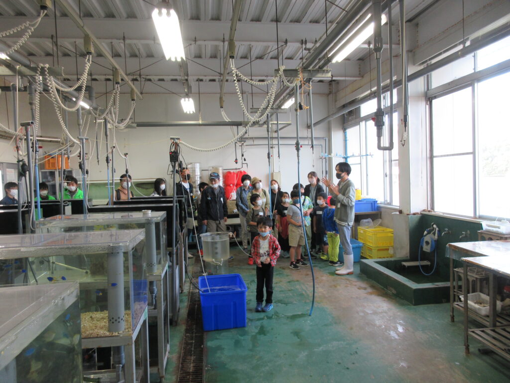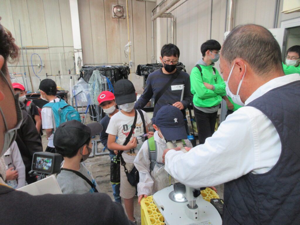 第1グループはテッポウギスの養殖施設の見学からスタートし、ワムシというエサの説明を受けた後、中型水層を泳いでいるキス(まだ小さい)を見学しました。また、マダイの稚魚の顕微鏡観察も体験しました。顕微鏡を覗く子どもたちの真剣な顔が印象に残っています。大型水槽では、まだテッポウまでは届いていないけれど、優に20cm越えのキスが悠々と泳いでいました。餌をやると素早い泳ぎで食べていきます。これもほとんどの子どもは初めての経験で、ちょっとびっくりしていました。「しまなみ寿司」さんで食べてみたいというお父さんもいました。