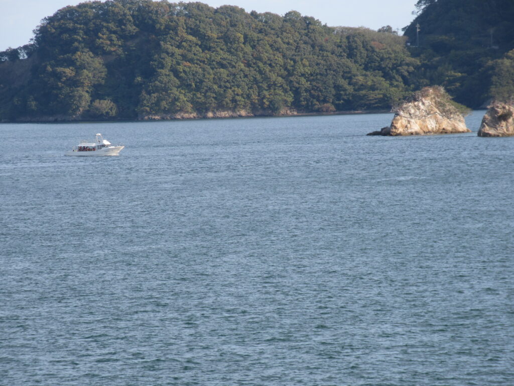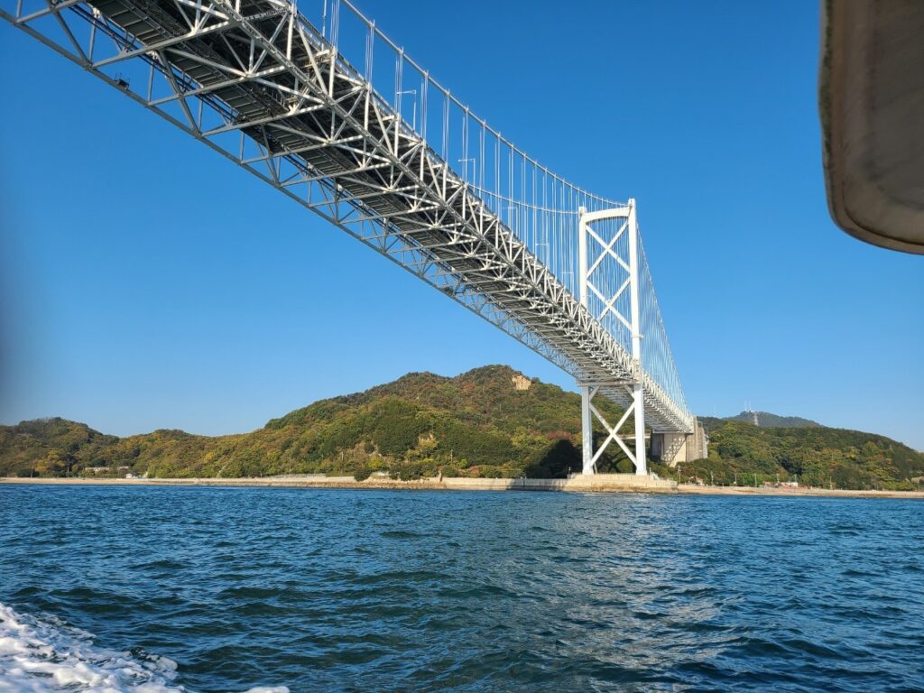 一方、爽風丸は近くの桟橋で待っていてくれました。ライフジャケットを着け、安全上の注意を聞いてから乗船しました。因島キャンパスの沖から因島大橋の下をくぐって、いわゆる布刈(めかり)瀬戸の遊覧コースです。この日は天気も良く風も穏やかだったので、船の乗り心地と因島大橋の裏側そして布刈の風景を堪能しました。