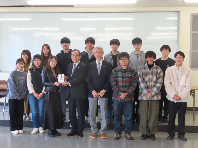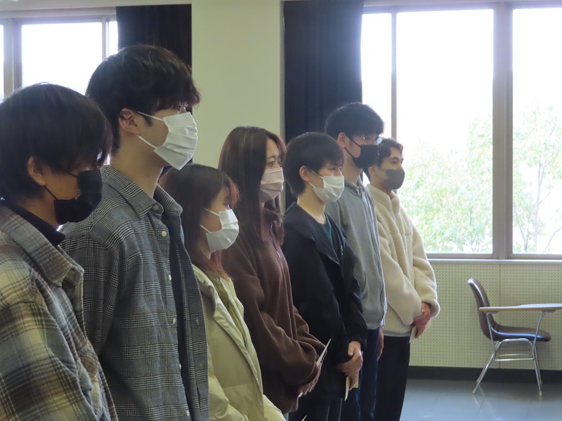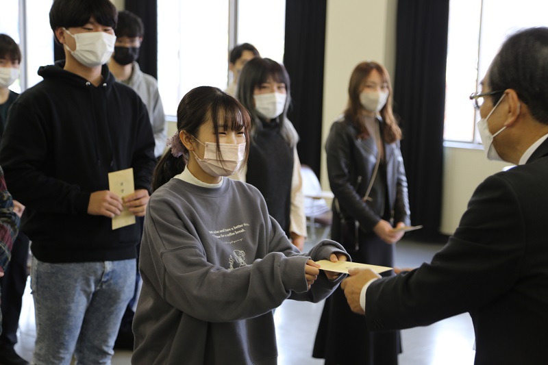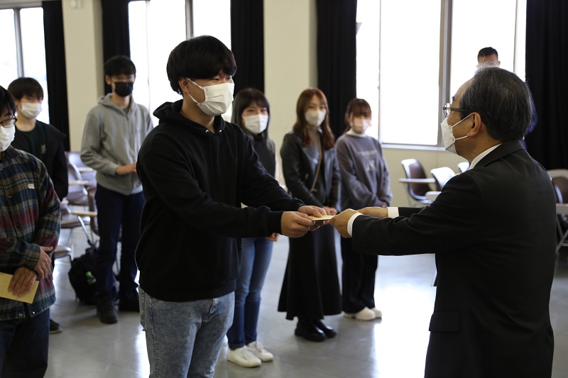 大塚学長からは、コロナウイルスの感染拡大の中、体調管理も大変であるが、しっかり学んでほしいとの激励の言葉がありました。ぜひ、ラオスでの成長につなげて、大学の期待に応えましょう。奨学金は学長から一人一人に手渡されました。