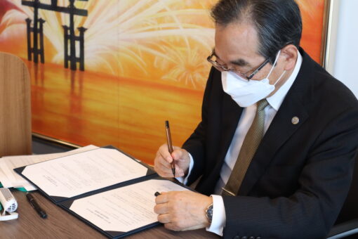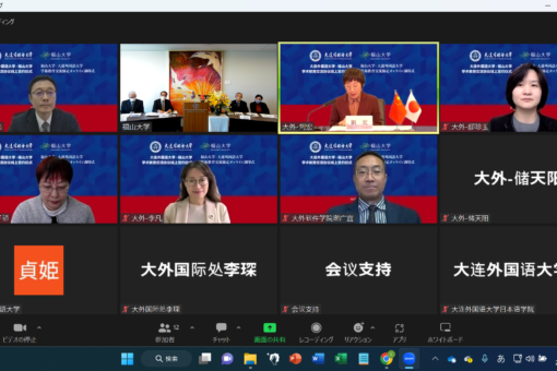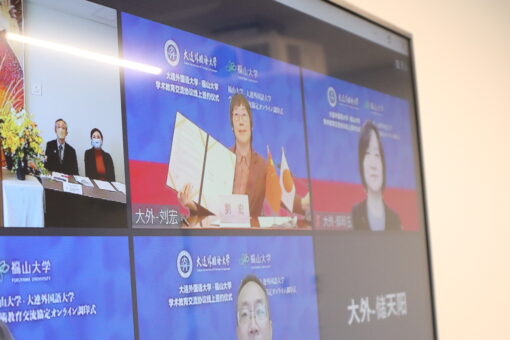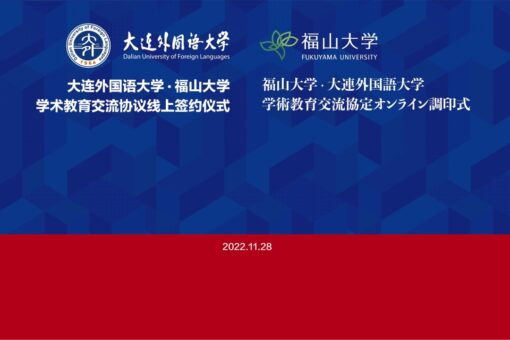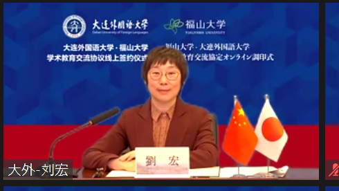 今回の協定締結式は、新型コロナウイルス感染症の影響によりオンライン形式を取らざるを得ませんでしたが、今後お互いを自由に行き来できる日が一日も早く到来することを願っております。大連外国語大学の学生・教職員の皆様方、福山大学に是非お越しいただければと思います。この度の協定締結により、双方の関係が更に深まり、学術教育交流の推進が期待されます。