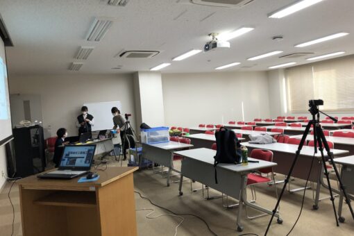 福山会場と広島会場で交互に発表を行いました。ポスターを画面に投影し、発表者は双方の会場で視聴中の方々に向かって話をしました。また、オンライン撮影を行った福山大学社会連携推進センターの8階会場と3階会場にテレビモニターを設置し、参加者はモニターの前で視聴しました。