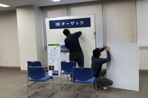 福山大学社会連携推進センターの8階と3階を使用した会場設営では、前日から同友会の企業や事務局のスタッフがポスターを搬入し、オンラインの設営準備をして、本番に備えました。