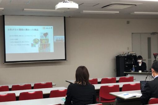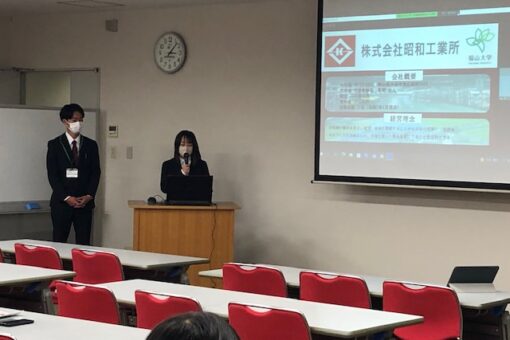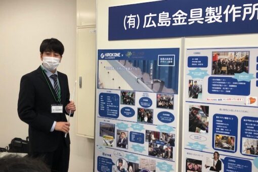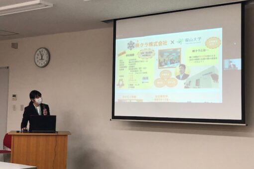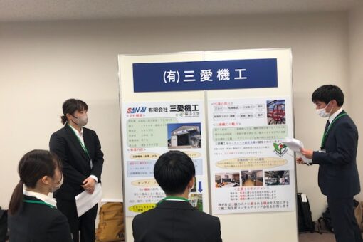 この催しは、広島県中小企業家同友会に加盟している企業を学生たちが訪問取材し、学生目線で企業の業務内容や一押しポイントを見つけ、就活を始める仲間へわかりやすく紹介するというイベントです。2年前から始まり、福山大学は昨年から参加しています。今年度は、福山大学の他に尾道市立大学、広島県立大学、広島修道大学、広島女学院大学、広島文教大学、安田女子大学の20チームが福山会場と広島会場をオンラインで繋ぎ、プレゼンを実施しました。