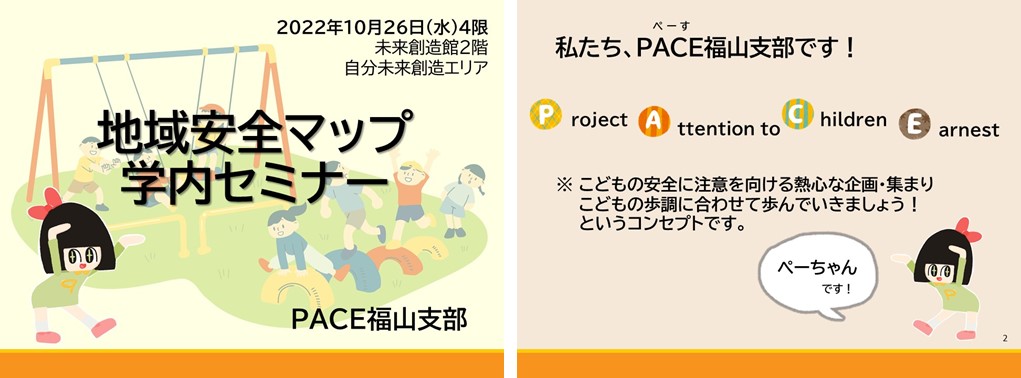 学内セミナーを通して、地域安全マップ作製のやりがいや楽しさを伝えることができました。PACE福山支部の活動は、私(濱本)が大学生の頃に始まり、16年間も続いている心理学科でも最も長いボランティア活動の1つです。これからも、たくさんの人に参加していただきたいです。そして、私(濱本)も一緒に、色んなことに挑戦していきたいです!
