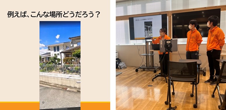 そのため、PACEメンバーで相談をして、フィールドワークの部分を工夫して、時間短縮しました。具体的な方法としては、実際にこれまでに小学生と一緒にフィールドワークを行った際に撮影した写真をディスプレイに表示し、そこがどんな場所なのか、どんな要素があり、なぜ危険・安全だと考えられるのかなどについて、参加者に対して問いかけながら説明する形をとりました。