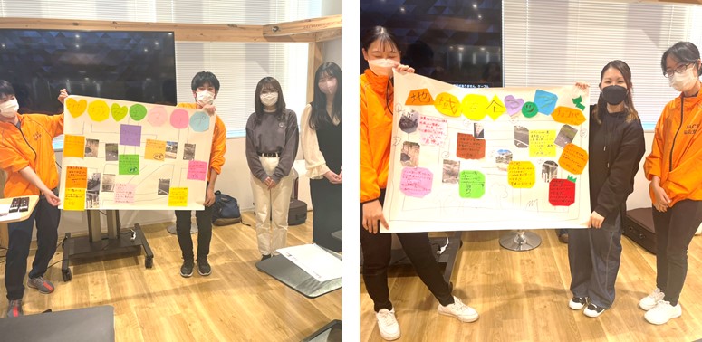 マップ作りは、普段通りの方法で行いました。フィールドワークまでは講義形式だったのですが、ここからは参加者も自分たちで考えて、手を動かして、マップを作る作業を行いました。小学校での活動では、見守りやアドバイスをするのみで、指導員は実際に手を出したりはしないのですが、今回は参加者が大学生ということもあり、一緒に作業をすることになりました。