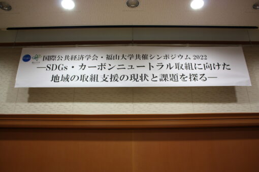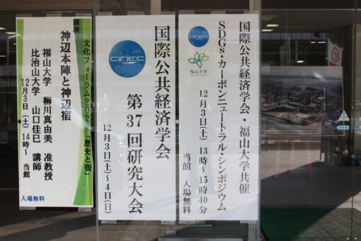 12月3日(土)~4日(日)、学校法人福山大学社会連携推進センターにて国際公共経済学会の研究大会が実施され、その中で福山大学経済学研究会との共催により、SDGs・カーボンニュートラルに関するシンポジウムが開催されました。日頃よりカーボンニュートラルに高い関心を示されている学校法人福山大学鈴木省三理事長をはじめ、多くの関係者の出席のもと、シンポジウムは盛大に行われました。大会実行委員長の経済学科楠田昭二教授(経済学部長)に代わり、学長室ブログメンバーのIが報告します。