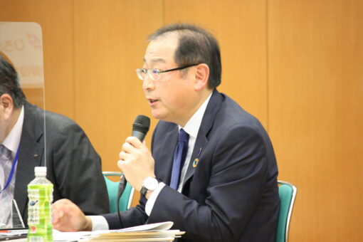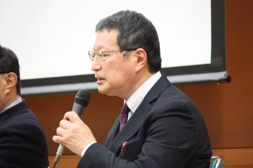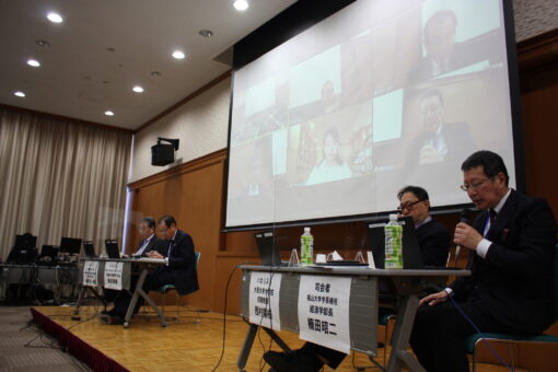 【司会進行は福山大学学長補佐・経済学部長の楠田昭二教授】