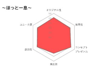 審査結果のレーダーチャートを見ると、この作品は審査項目の全ての項目でほぼ8割を確保していることから、実務家の方々に高い評価を得ていることが分かります。審査結果には、レーダーチャートと共に、ラックス建設の学生たちへの厳しいながらも将来を考慮した想いが詰まったコメントが添えられています。最優秀賞の作品に対しては、「パース、プレゼンも分かりやすく、イメージがしやすいものでした。コンセプトは親しみやすく、またパースだけでもほっと一息の思いを感じ取れた。」と讃えていますが、「作品のすばらしさに反比例して、施工するには少々難しいと感じました。」と様々な観点からの思いやりのあるコメントが学生たちに贈られました。