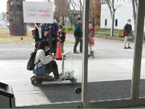 2022.06.23の学長室ブログにおいて、工学部のみらい工学プロジェクトで製作した人が乗ることができる自動運転電気自動車の自動運転が成功したことについて報告しましたが、この自動運転電気自動車と、山之上が作成したテレポートドレッサー(2020.09.15の学長室ブログ)と、工学部スマートシステム学科で開発されたGamePoyno2(2019.08.02の学長室ブログ)と、工学部で開発された二酸化炭素濃度警報装置(2021.10.13の学長室ブログ)を、Ogaki Mini Maker Faire 2022 で出展してきました(福山大学Makers)。